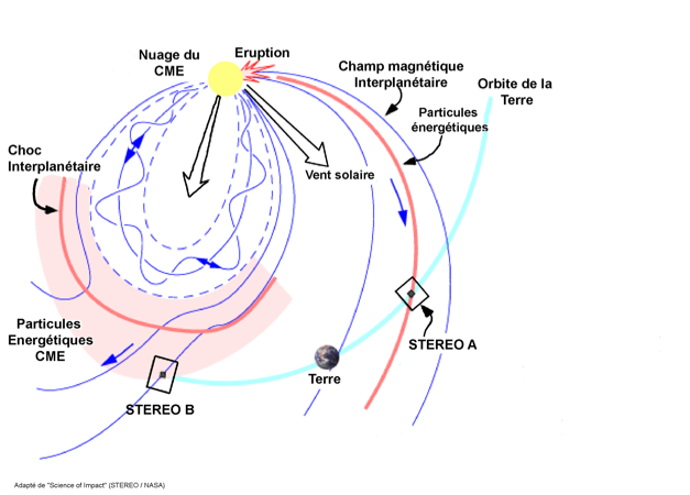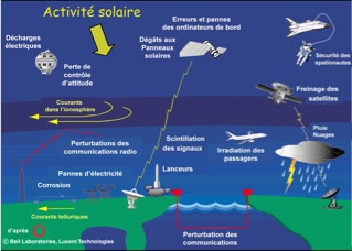Elles sont à l’origine de perturbations plus ou moins importantes dans l’environnement terrestre : perturbations du champ magnétique terrestre (orage magnétique et aurores boréales), dommages causés sur les satellites, problème de liaisons téléphoniques ou radio par câble, coupure de l’alimentation électrique sur de grandes régions…