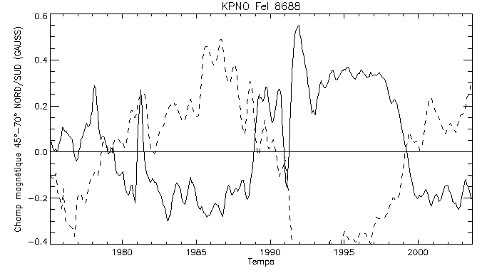 Champ magnétique des pôles Nord et Sud (latitude > 70°, en pointillé le nombre de taches)