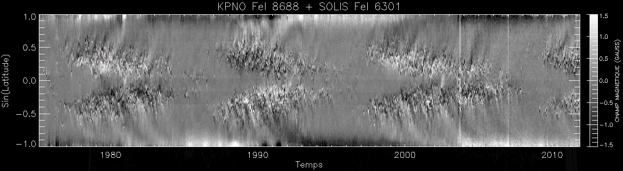 Champ magnétique moyen en fonction de la latitude de 1975 à 2012 (animation MPEG1, cycles 21, 22, 23 et montée du cycle 24)