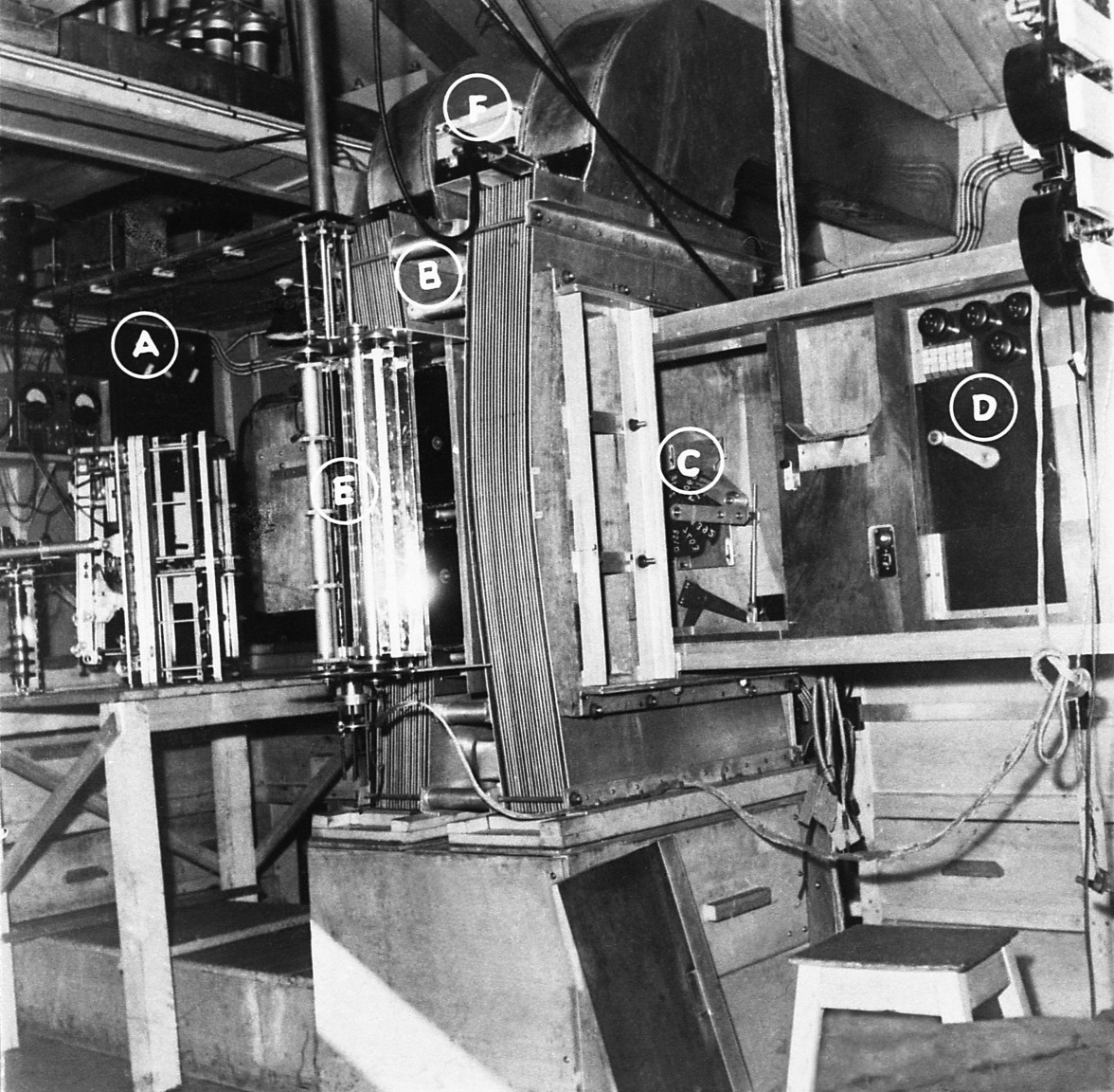 | A - Le grand electro-aimant de Meudon-Bellevue et la chambre de Wilson du LLR (1939) | ||