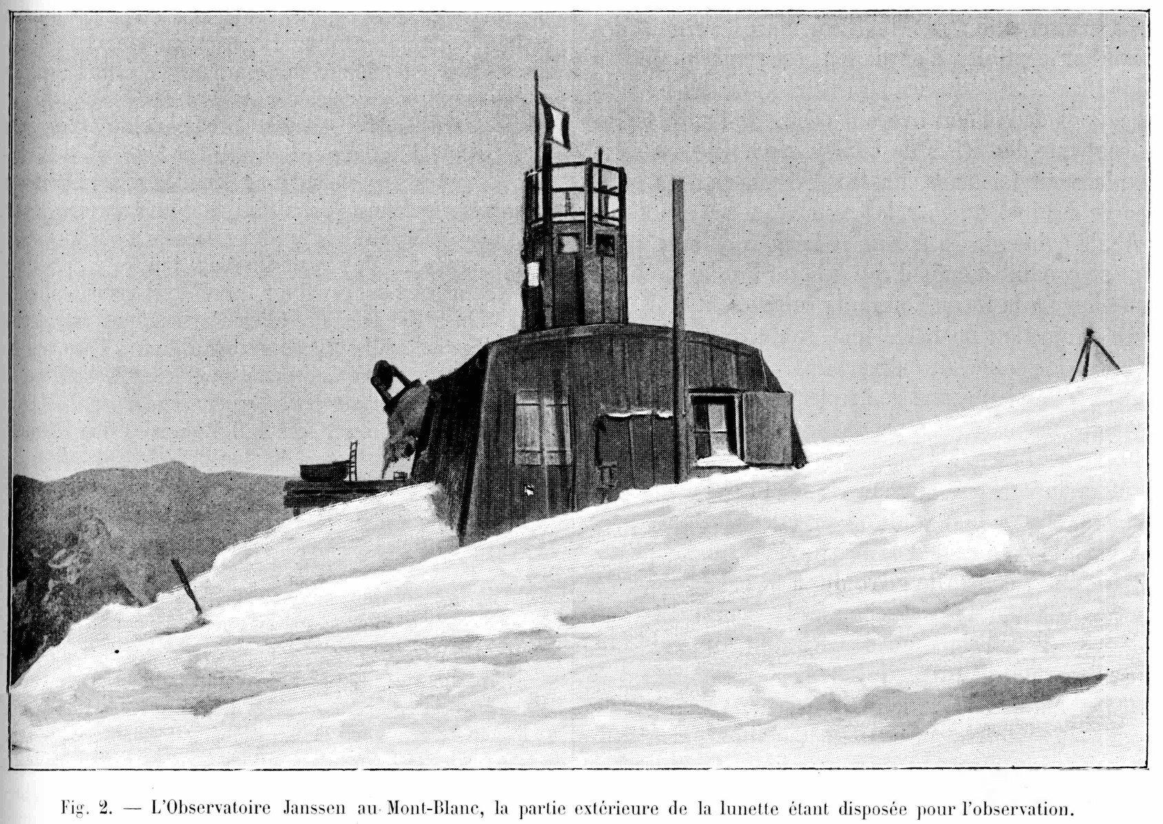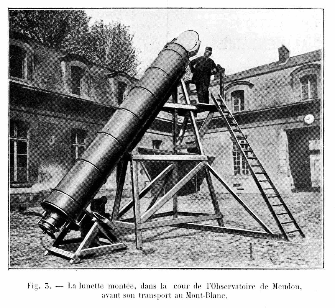 La grande lunette de l'Observatoire du Mont-BlancG. MILLOCHAU (La Nature, 1906)Parmi les instruments employés dans les études de l'astronomie physique il en est un, peu connu, qui occupe une situation actuellement unique au monde, c'est la grande lunette de l'Observatoire du Mont-Blanc. En 1890, M. Janssen eut cette audacieuse idée de fonder, à l'altitude de 4810 mètres, un observatoire astronomique et malgré toutes les difficultés d'une pareille entreprise, réussit à la réaliser. Placée au sommet du pic le plus élevé de l'Europe, cette station scientifique affranchit l'observateur de la partie la plus gênante de l'atmosphère terrestre, et, favorable dans tous les cas, permet de tenter certaines recherches qu'il est impossible d' exécuter aux faibles altitudes. L'instrument le plus important de cet observatoire est sa grande lunette, œuvre du constructeur Gauthier, et qui, sans être un des géants de l'astronomie, possède déjà des dimensions pouvant le faire classer parmi les grands instruments. L'objectif taillé par les frères Henry a 30 centimètres de diamètre et 5,40 m. de distance focale. Un miroir plan de 60 centimètres de diamètre renvoie dans la lunette la lumière des astres à étudier. La monture de cet instrument, ingénieusement combinée, constitue un sidérostat polaire. Un tube fixe, formant enveloppe, maintenu à la partie supérieure par un pivot fixé à la construction, repose à la partie inférieure sur un bâti muni de vis calantes. Grâce à ce dispositif, on peut donner au tube les mouvements nécessaires pour rendre son axe parallèle à la ligne des pôles. Un premier tube, large de 70 centimètres, sert de support à un autre, plus petit de moitié, qui tourne sur des galets fixés au premier. A la partie supérieure et en avant de l'objectif est placée une sorte de fourche très solide en fonte de fer supportant le miroir lequel est encastré dans un barillet métallique qui tourne autour de deux tourillons. Ce barillet porte un cercle divisé indiquant à l'observateur la déclinaison du rayon réfléchi par le miroir dans l'instrument. La division est éclairée par une ampoule électrique et visée par une petite lunette, placée près de l'oculaire, et destinée à la lecture de ce cercle. Une roue dentée, liée au barillet du miroir, est mue par une vis tangente fixe, dont le mouvement est commandé par une transmission fixée au petit tube. L'observateur agissant sur une manivelle, fait mouvoir le miroir, tout en lisant la division du cercle de déclinaison ou en observant à l'oculaire. Un objectif de 8 centimètres est fixé au petit tube, et, avec un oculaire placé près de l'oculaire principal, constitue un chercheur puissant; il reçoit les rayons réfléchis par la partie du miroir, qui, placée près d'un tourillon, n'est pas utilisée par le grand objectif. L'autre partie du miroir non employée envoie la lumière dans un chercheur plus petit. La partie inférieure du petit tube est solidement reliée à un grand cercle métallique portant sur son pourtour une denture sur laquelle engrène une vis tangente mue par un mouvement d'horlogerie. Ce cercle sert aussi de support aux divers accessoires de l'instrument : oculaires des chercheurs, porte-oculaire de la lunette, manivelle actionnant la déclinaison, et, sur sa face tournée vers l'oculaire, est tracée une division en 24 heures donnant l'angle horaire de l'astre visé. Le porte-oculaire mérite une attention spéciale. Il est composé de deux tubes de 25 centimètres de diamètre l'un fixe, l'autre mobile par rapport au premier et mû par une forte vis de rappel. Un tube assez long rentre dans le tube mobile, un solide collier de serrage peut le maintenir dans la position choisie. C'est sur l'extrémité de cette dernière pièce que peuvent venir s'attacher, par l'intermédiaire d'un dispositif à bayonnette, les appareils destinés à utiliser la lumière venant des astres étudiés: micromètre, chambre photographique, spectroscopes, etc... L'Observatoire du sommet du Mont-Blanc a deux étages, dont l'un est entièrement enfoui dans la neige. La lunette traverse la paroi nord de l'étage supérieur, le miroir étant à peu près au niveau du toit; le tube perce ensuite le plancher et se termine dans l'étage inférieur, où se trouve le mouvement d'horlogerie et les pièces oculaires. Pour se servir de l'instrument, l'observateur le place de manière que les cercles indiquent les coordonnées de l'astre à viser. Il se sert ensuite des chercheurs pour rectifier la direction du miroir et amener, au centre du champ, l'image de l'objet à étudier. Dans les ascensions que je fis de 1903 à 1905 j'ai installé un spectroscope spécialement construit pour cette grande lunette. Ce spectroscope se compose pour la partie optique : d'un collimateur de 60 centimètres de long, d'un prisme de flint à 30 centimètres dont la 2e face est argentée, et de deux lunettes pouvant se substituer l'une à l'autre et ayant respectivement 30 centimètres et 60 centimètres de long. Les rayons venant du grand objectif tombent sur la fente du collimateur, sont rendus parallèles par la lentille de ce premier organe, traversent une première fois le prisme, puis une seconde fois après réflexion sur la face argentée, et sont reçus dans la lunette du spectroscope. La fente est en nickel poli, elle est légèrement inclinée sur l'axe du collimateur et réfléchit les rayons del'astre étudié, par l'intermédiaire d'un miroir, dans une petite lunette auxiliaire mise au point sur cette fente et qui permet par suite, en agissant sur les mouvenents de rappel de la lunette, de maintenir l'astre visé au point choisi sur la fente. Une seconde lunette auxiliaire reçoit la portion de la lumière qui est réfléchie par la 1ere face du prisme, elle a le même but que la précédente. Ces deux dispositifs se complètent et sont à peu près indispensables à tout spectroscope ou spectrogr