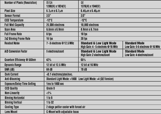 Specifications of the two cameras