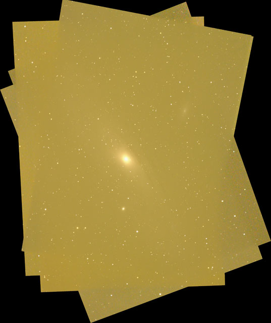 Recalage et sommation d'imagesLe bruit étant minimisé au cours de l'acquisition, on peut encore augmenter le rapport signal sur bruit en sommant des images prétraitées. Ceci implique de recaler les images les unes par rapport aux autres (les "coregistrer") et d'en faire une pile, en utilisant des détails ponctuels comme repères (étoiles brillantes, cratères...). Le recalage précis des images est également indispensable pour compositer des images obtenues dans différents filtres, pour mettre en évidence les évolutions temporelles (par différences) ou pour reconstituer des mosaïques ou des cartes à partir d'images en recouvrement partiel. Si les images sont suffisamment nombreuses (au moins 3, plutôt 5), la sommation peut être réalisée à l'aide d'une médiane plutôt qu'une moyenne : le bruit résultant est encore réduit, et les défauts cosmétiques ponctuels sont corrigés au passage. Dans le cas d'objects lumineux acquis à courts temps de pose on a souvent intérêt à ne pas sommer, mais plutôt à sélectionner les meilleures images pour conserver la meilleure résolution angulaire. Pour compositer différents filtres, il est bon de vérifier que la dimension des images est identique : différents filtres peuvent introduire un grandissement légèrement différent. La correction de taille est délicate (de même que le redressement angulaire si la caméra a bougé) : le redimensionnement introduit souvent des artefacts très visibles, et peut interdire les mesures quantitatives. Sur les grands télescopes, on fait ainsi couramment des séries