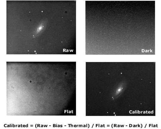 Le signal de sortie d'une matrice CCD est la somme du courant d'obscurité et de l'intensité mesurée sur l'objet, à travers l'atmosphère et l'optique du télescope, convertie en électrons. Le prétraitement, ou calibration, consiste à retrouver une mesure proportionnelle à l'intensité lumineuse incidente, c'est-à-dire l'image formée sur la matrice. La calibration absolue consiste à convertir cette mesure donnée en pas-codeurs vers une mesure en unités d'intensité lumineuse.