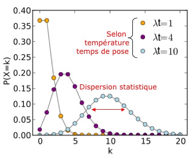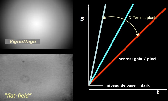 Méthodes de calibration alternativesOn préfère souvent simplifier la méthode décrite ci-dessus en faisant quelques approximations : l'important est de minimiser le bruit apporté par les corrections successives. • Plutôt que de soustraire un vrai courant d'obscurité (mesuré) au signal, on préfère souvent soustraire la valeur moyenne du fond de ciel mesurée sur une partie de l'image elle-même, surtout si la caméra est bien refroidie. Ceci évite de rajouter le bruit thermique et le bruit de lecture une seconde fois dans le premier terme ci-dessus, et ça évite de faire les darks ; on soustrait également de cette façon la valeur du fond de ciel (lumière diffuse). Il est bon d'avoir vérifié auparavant que les darks sont uniformes quel que soit le temps de pose. • Si fond de ciel est très lumineux mais non uniforme, on peut soustraire une image du fond de ciel acquise à côté de l'objet (observation près d'une ville, ou en IR lointain). Cette méthode a l'avantage de corriger un biais additionnel, que l'observateur ne contrôle pas. Elle permet également de ne pas mesurer les darks, mais ne réduit pas autant le bruit ajouté durant la correction. Dans cette situation, la correction du dark est plus importante que celle de la PLU. • Si les PLU sont très lumineuses (acquises de jour), on peut ne soustraire à la PLU que l'offset mesuré Ib plutôt que le courant d'obscurité. Ceci n'est pas forcément vérifié, en particulier quand on travaille aux extrémités du domaine spectral du CCD (vers 0,3 µm ou 1 µm).