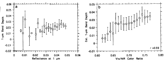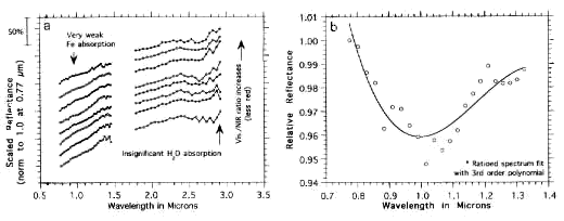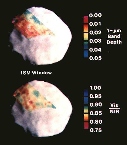 ![]() Observations du spectro-imageurISM projetées sur une image de la caméra de bord de Phobos-2 (VSK). La profondeur de la bande à 1 µm dépend de la composition et des effets de maturation (Murchie & Erard, 1996). |