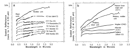 Les observations d'ISM indiquent au contraire une similitude avec certaines météorites L (chondrites ordinaires sombres), les astéroïdes de type T, et surtout avec les terrains lunaires matures. Les deux figures ci-dessus illustrent cette comparaison (l'unité rouge est un composite KRFM-VSK-ISM, l'unité bleu un composite KRFM-VSK). Une interprétation attrayante est que Phobos s'est formé à l'intérieur du Système solaire (à la distance de Mars) et n'est pas un objet exotique capturé par la planète. L'unité observée par ISM serait largement modifiée sous l'influence des micrométéorites et du vent solaire ("space weathering") comme c'est le cas sur la Lune. L'autre unité n'est pas bien caractérisée spectralement, mais sa corrélation avec les cratères d'impact indique que le matériau provient de l'intérieur de Phobos ; il pourrait s'agir soit du même matériau fraîchement exposé et non altéré, ou bien d'un matériau différent constituant l'essentiel du volume, qui indiquerait que Phobos est un assemblage de débris ayant connus des histoires très différentes pendant les premiers temps du Système solaire. |