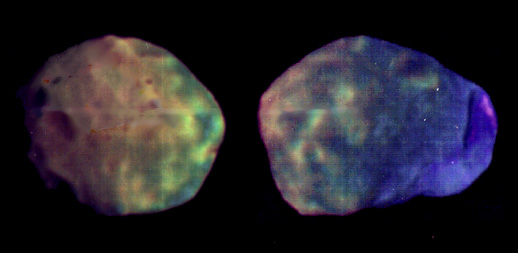 Rapport des images VSK dans les deux filtres visible et infrarouge. La région de Stickney et ses éjectas apparaissent beaucoup plus bleu que les autres régions, indiquant une surface plus jeune (Murchie et al., 1991). |